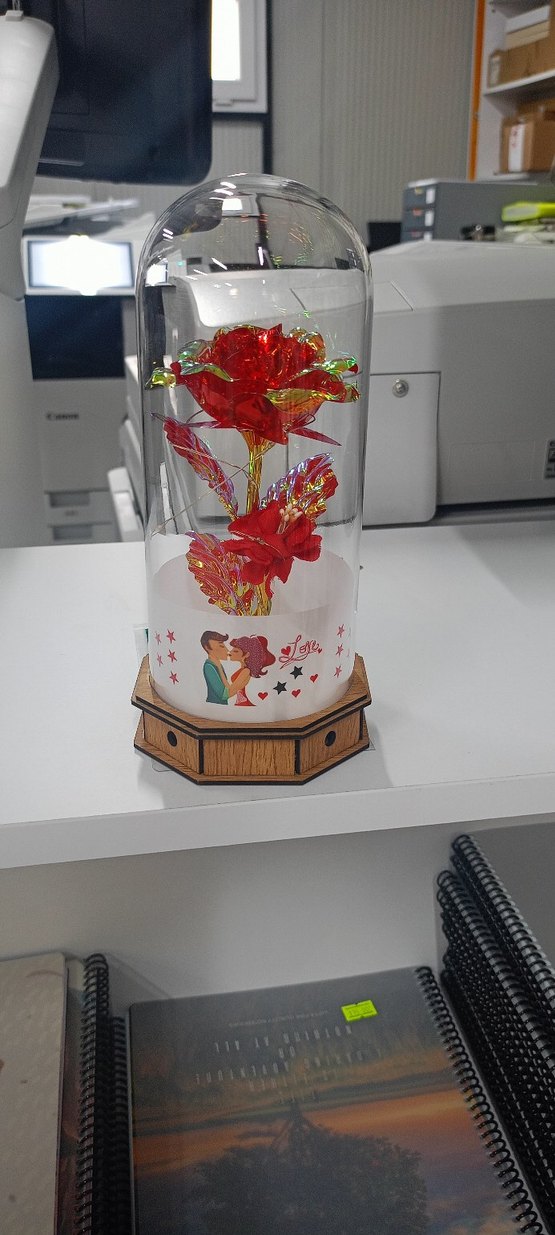 Ahşap tabanlı cam fanus içinde renkli kırmızı gül ve alt kısmında romantik "Love" yazısı ile süslenmiş dekoratif ürün.