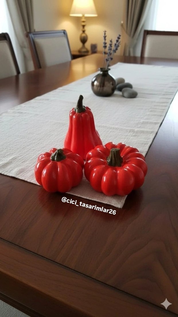 Parlak yüzeyli, dekoratif kullanıma uygun renkli kırmızı kabak figürleri. Üzerinde @cici_tasarimlar26 işareti bulunur.
