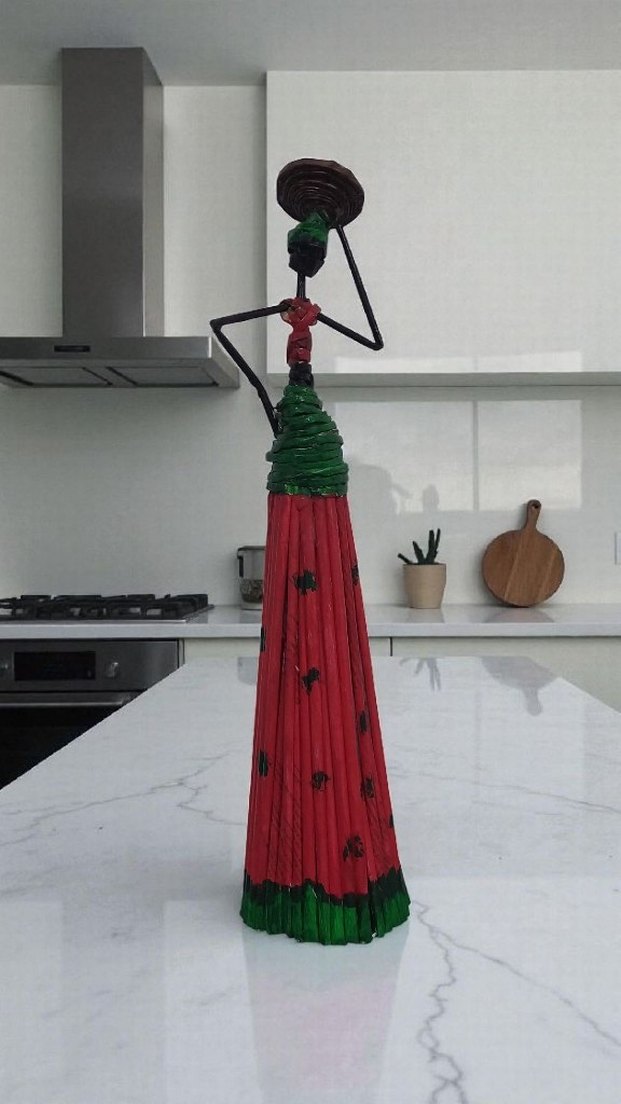 Renkli kırmızı ve yeşil elbiseli, başörtülü uzun ve ince kadın figürü, dekoratif bir hava katıyor. Tamamen el üretimidir. Kağıttan üretilmiştir.