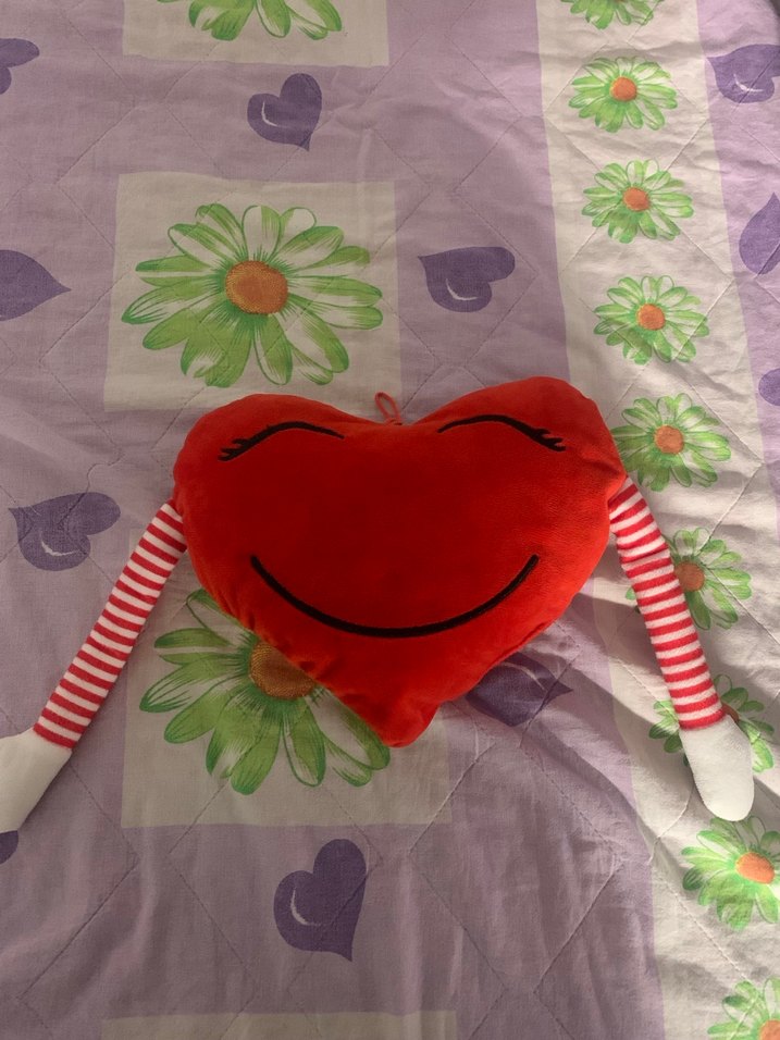 Yumuşak kırmızı kalp peluş oyuncak, renkli çizgili kollara ve gülümseyen yüze sahip. Neşeli ve sarılmalık bir arkadaş. ❤️