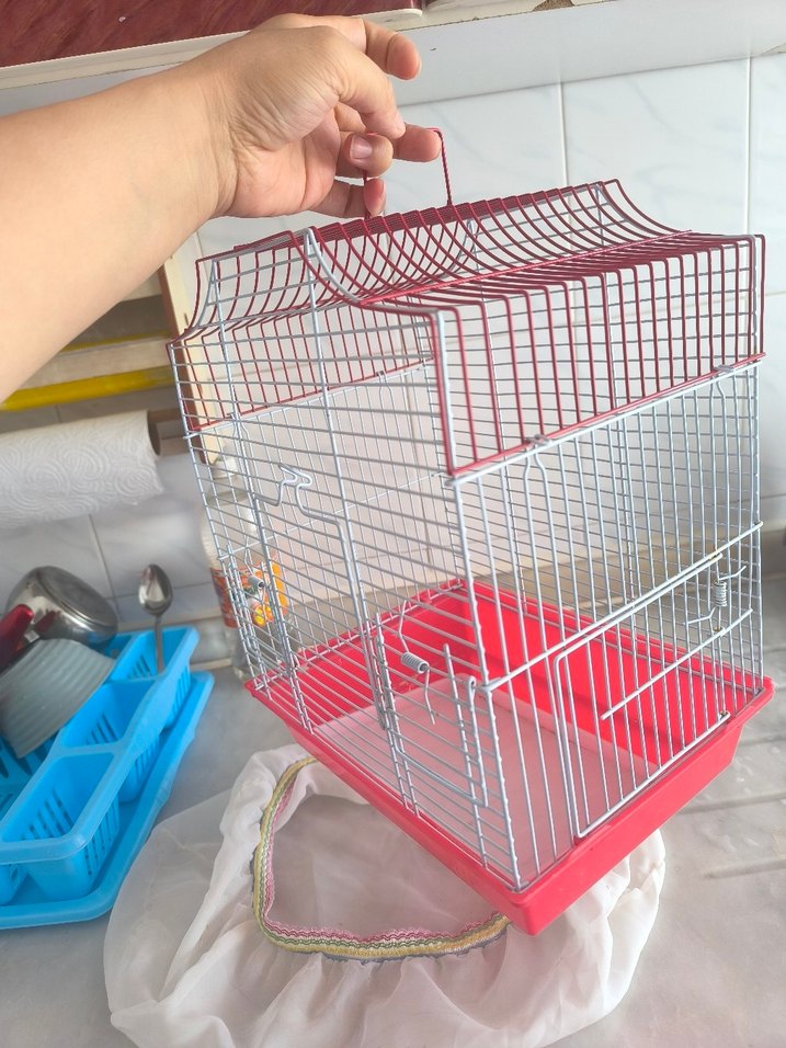 Kırmızı taban ve üst kısmı olan, metal kafes yapısına sahip renkli kuş kafesi. Taşımak için kulpu bulunur, iç hacmi geniştir. İstanbul Bağcılar elden teslim