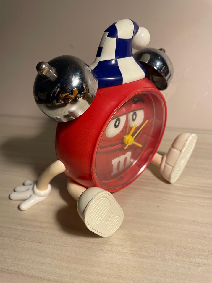 Canlı kırmızı renkte, M&M karakterli masa saati. Klasik çift zil alarm ve hareketli kol ile bacaklara sahip. ⏰