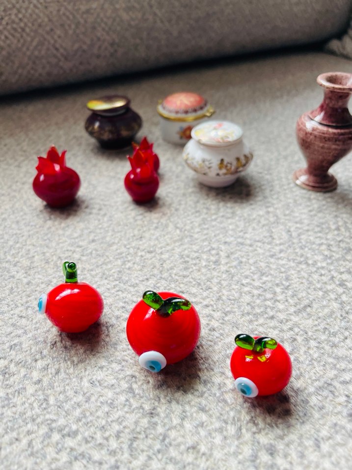 Yeşil detaylı, gözlü kırmızı küçük figürler, minyatür çömlek ve vazolar yanında sergilenmiş.