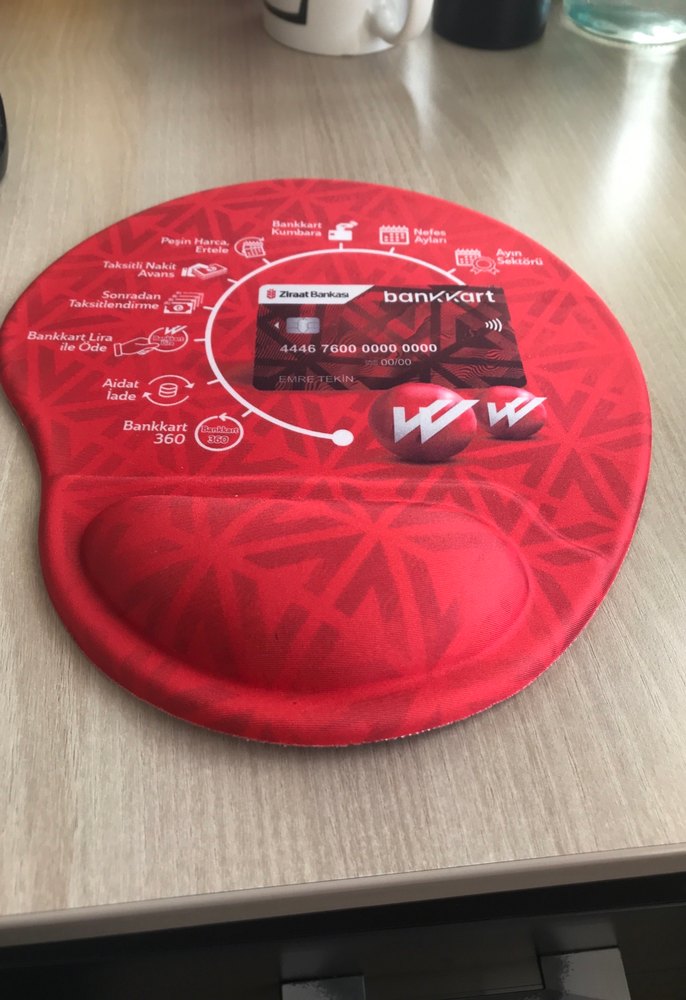 Banvo logosu ve bankacılık simgeleri bulunan, bilek destekli renkli kırmızı mouse pad. ️