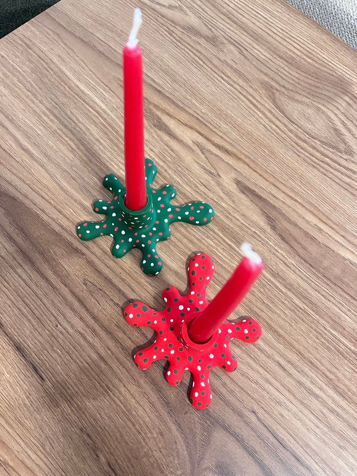 Kırmızı ve yeşil renklerde, sıçrama şeklinde renkli mumluklar canlı kırmızı mumları tutar . Mekâna eğlenceli bir hava katar. ️adet fiyatıdır 1 mum dahil