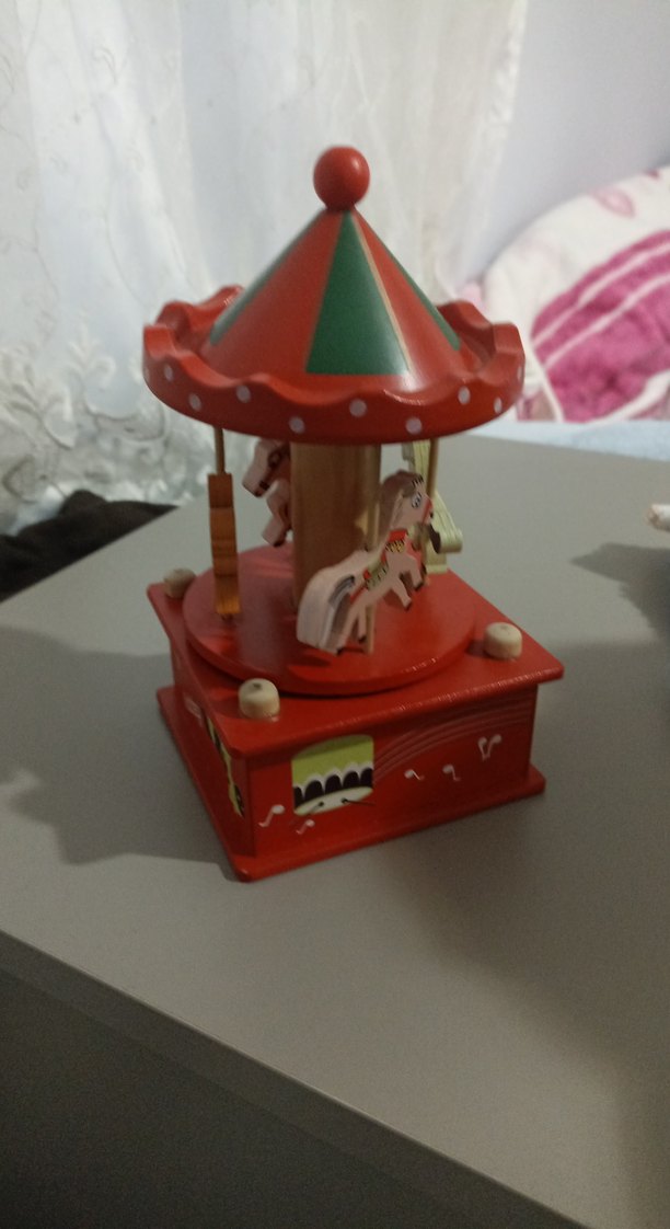 Renkli kırmızı müzikli atlı karınca oyuncak, küçük at figürleriyle müzik çalar ve döner. Odaya hoş bir dekoratif öğe. müzik li değil atları çıkıp takılıyor boyu küçük değil orta boy iki parça halinde kargo yapılacaktır siz yapıştırıp kuracaksinz