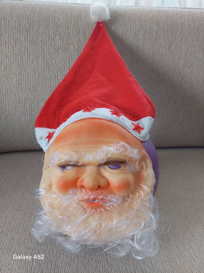 Yumuşak beyaz sakallı, yıldızlı kırmızı şapkalı renkli Noel Baba maskesi, Yeni Yıl kutlamaları için uygun.