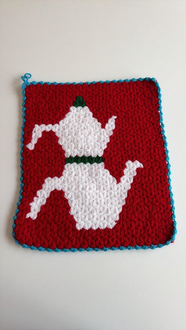 Beyaz çaydanlık desenli, mavi kenarlıklı kırmızı örgü banyo süngeri.