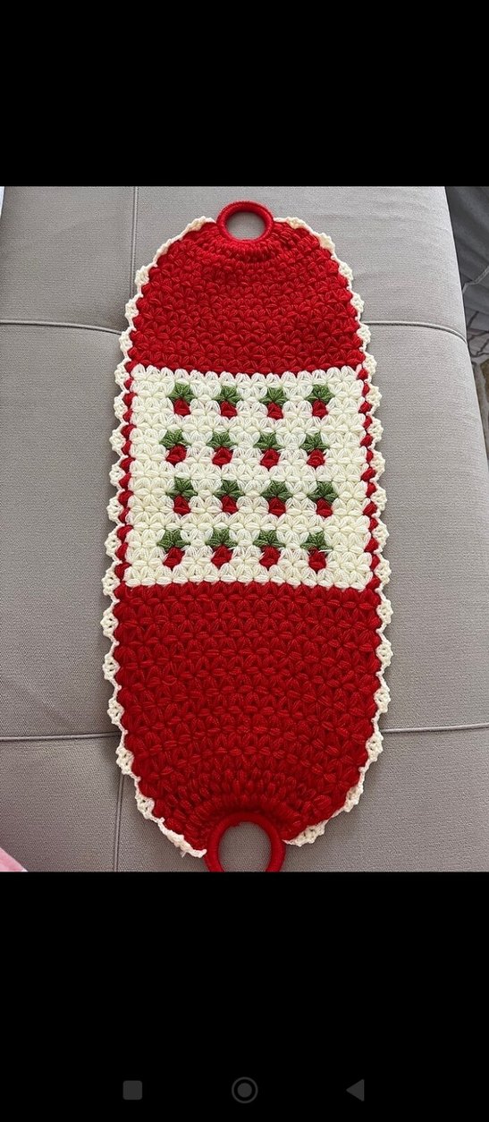 Kırmızı ve beyaz renklerin yeşil detaylarla birleştiği, iki ucunda tutma halkaları bulunan renkli örgü banyo süngeri.