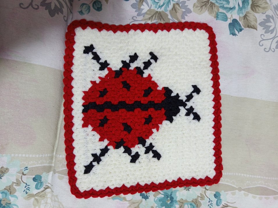 Renkli kırmızı örgü banyo süngeri, uğur böceği deseniyle el yapımı ve yumuşak, nazik temizlik için uygundur.