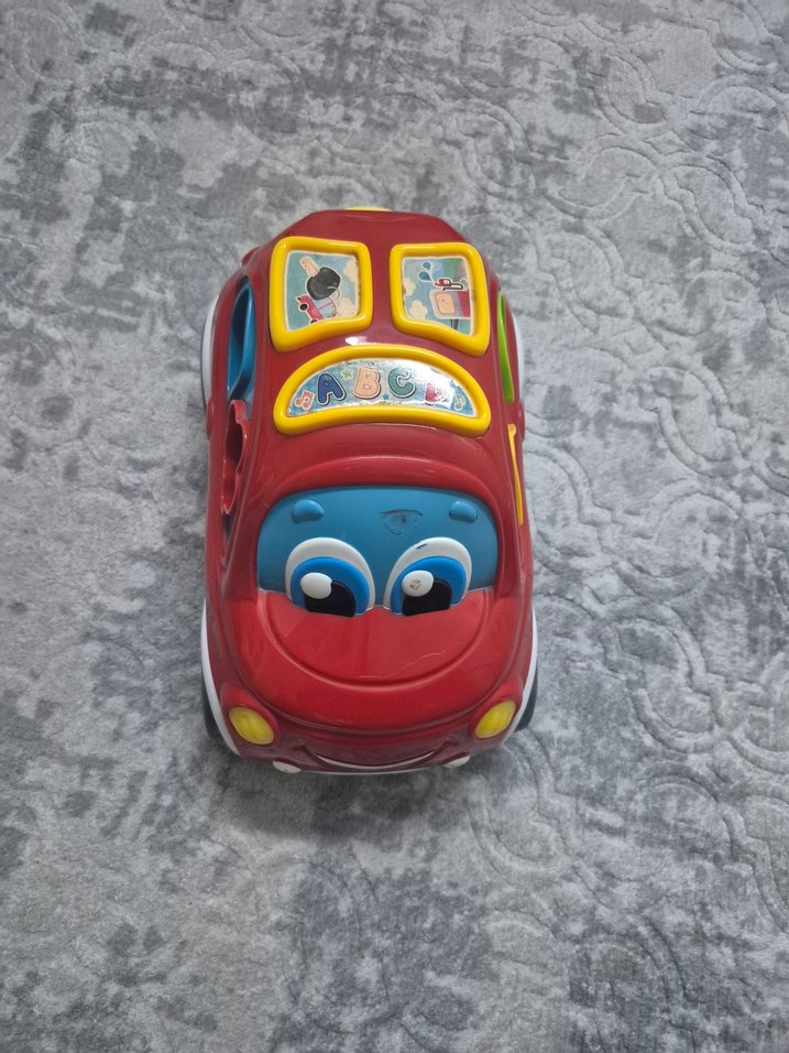 Üzerinde eğitici ABC butonları ve oyuncu gözleri bulunan kırmızı renkli oyuncak araba. Eğlenceli ve öğretici. yalnızca takma aparatları mevcut değildir