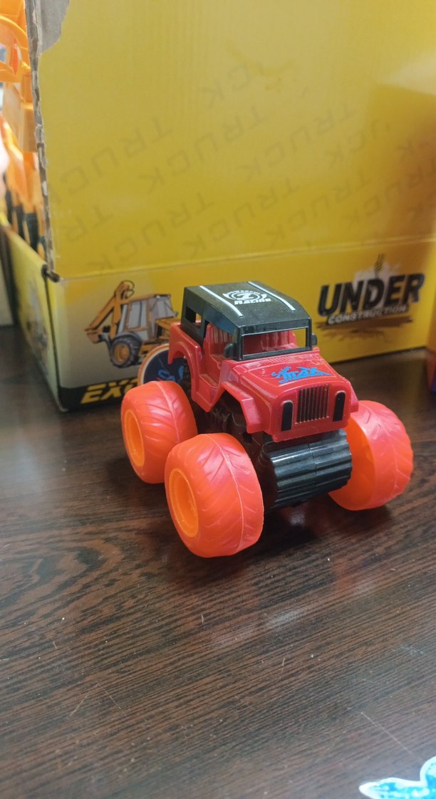 Büyük turuncu tekerlekleri ve siyah tavanı olan kırmızı renkli oyuncak araba. Üzerinde 'UNDER' yazısı bulunur.