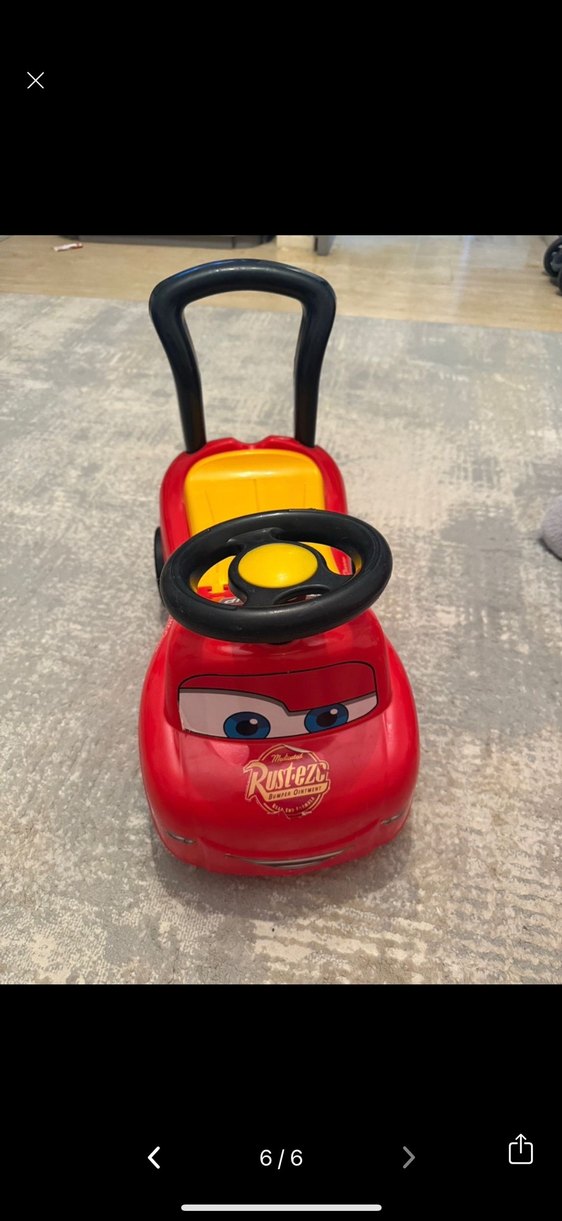 Renkli kırmızı oyuncak araba, direksiyon ve itme sapına sahiptir. Önünde "Rusteze" yazısı ve gözler bulunur. İtmeli araba ilk adım