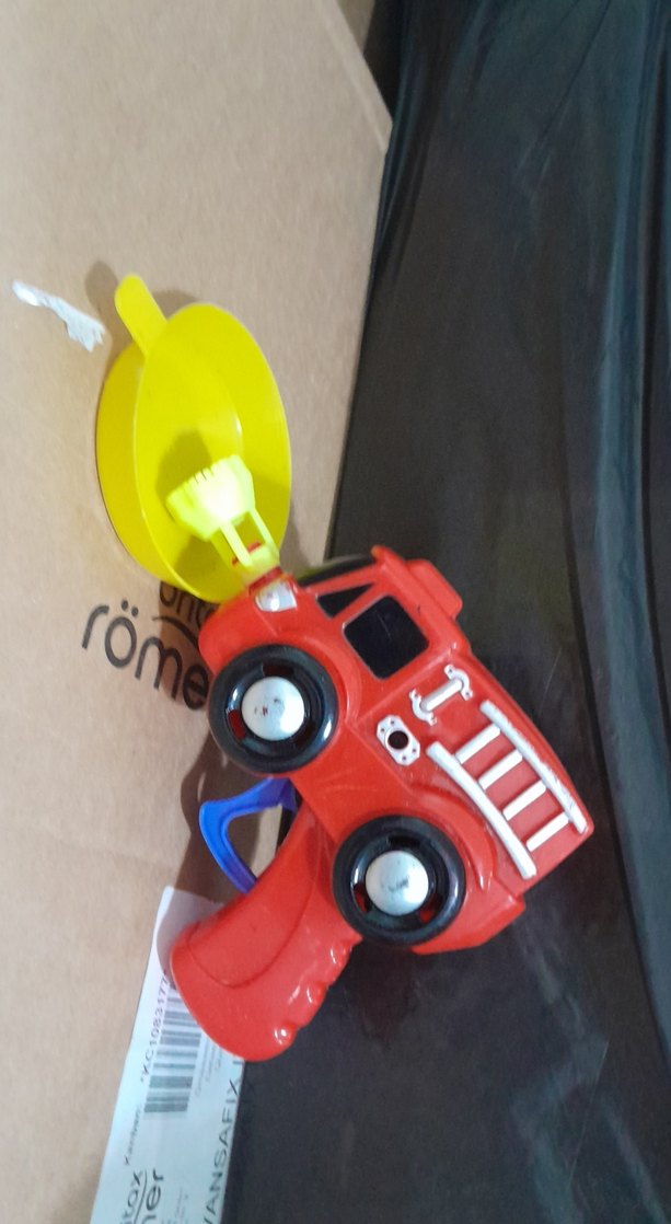 Kırmızı gövde, siyah tekerlekler ve sarı kepçe aparatı olan renkli oyuncak itfaiye arabasıdır su baloncugu alttaki sarıda su baloncugu için kabidir