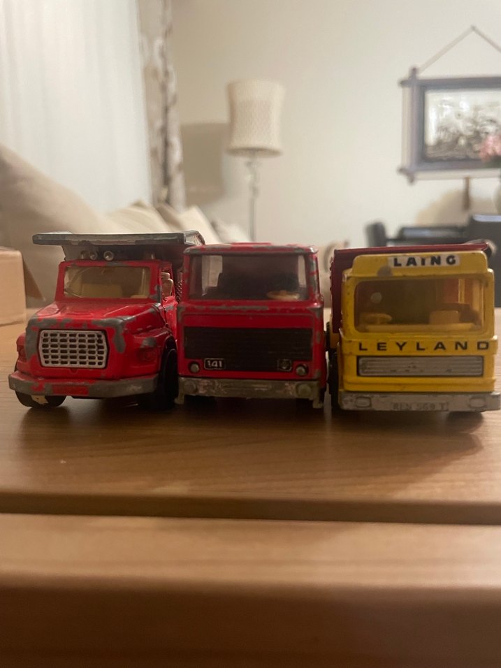 Ön ızgaraları ve pencereleri detaylı kırmızı ve sarı renkli üç oyuncak kamyon seti. Eğlenceli ve koleksiyonluk.