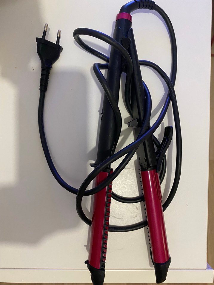 Uzun kablo ve Avrupa tipi fişi olan renkli kırmızı saç düzleştirici.