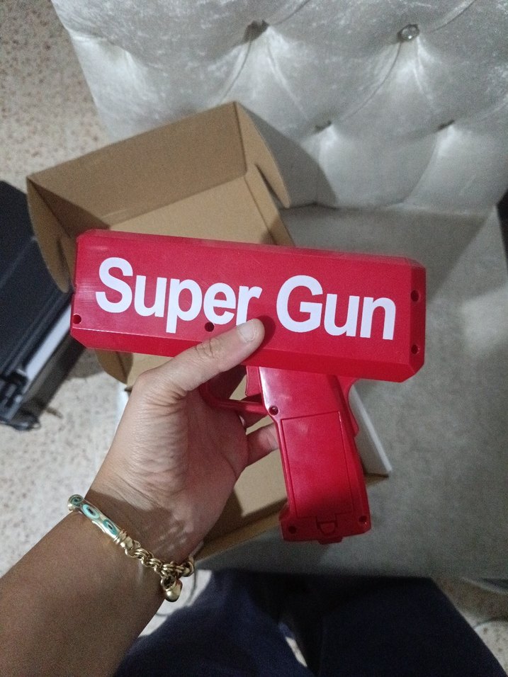 "Super Gun" yazılı renkli kırmızı oyuncak tabanca, basit tasarıma para fırlatıyor pille çalışıyor