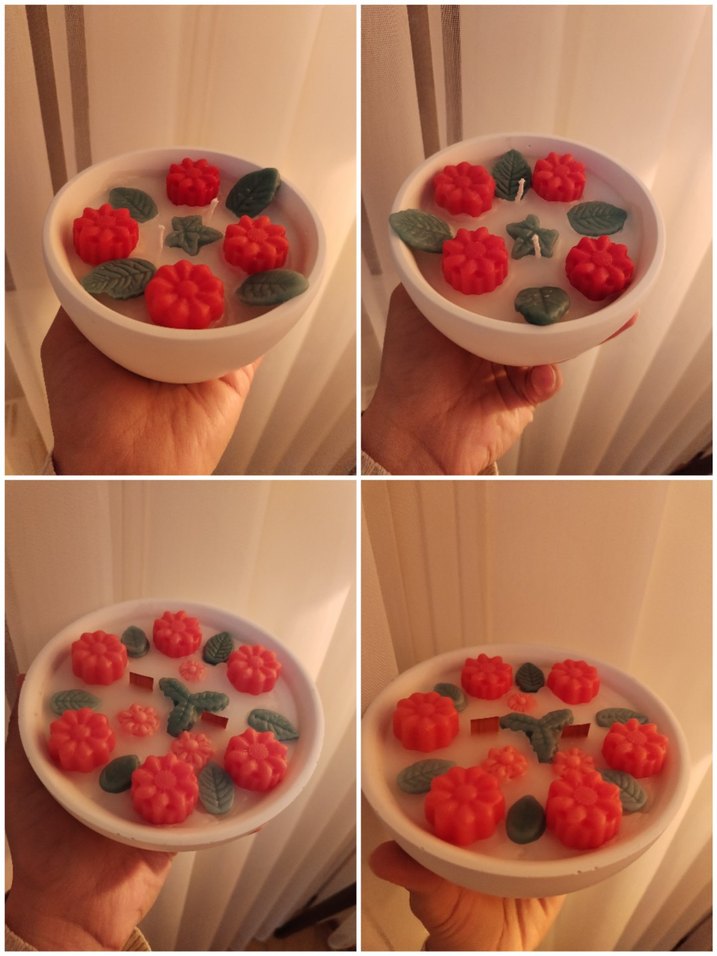 Beyaz mum içinde kırmızı çiçek ve yeşil yaprak detayları bulunan renkli ve dekoratif mum. ️adet fiyatıdır