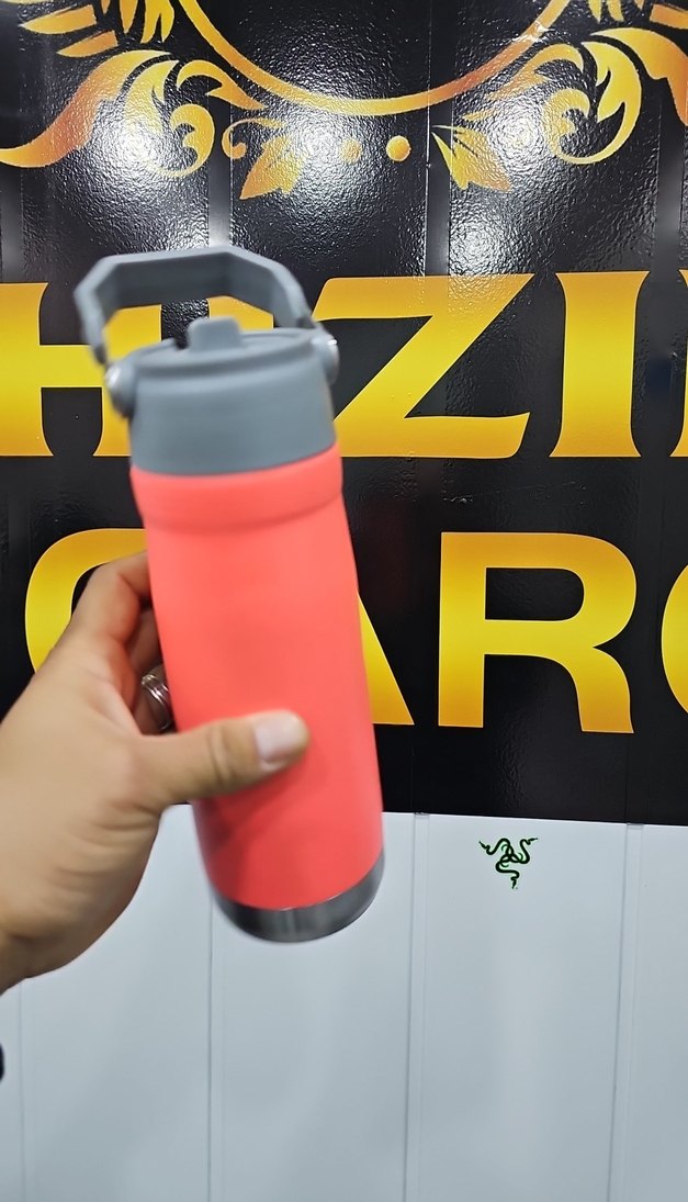 Renkli kırmızı çocuk termos şişesi, dayanıklı sap ve yalıtımlı yapıya sahiptir. İçecekleri sıcak veya soğuk tutar. "R" harfi ile işaretlenmiştir.