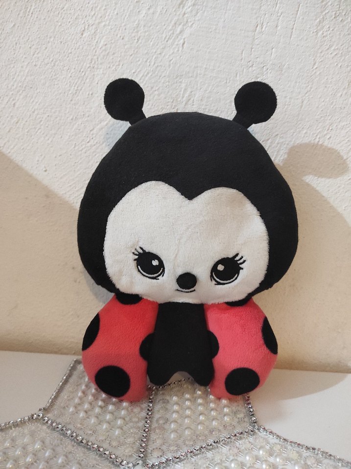 Kırmızı ve siyah detaylara sahip renkli uğur böceği tasarımlı yumuşak peluş oyuncak.