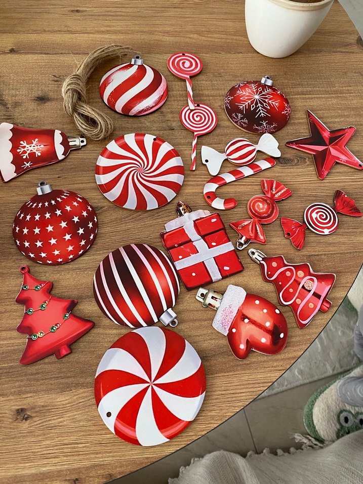 Farklı desenlerde kırmızı yılbaşı topları, yıldızlar, şeker ve hediye figürlerinden oluşan renkli süs seti.