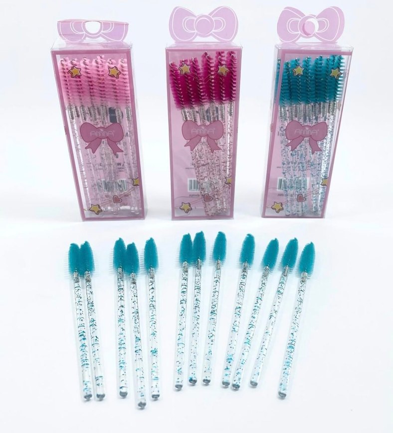 Pembe, mor ve mavi renklerde, süslü saplı renkli kirpik fırçaları seti. Makyaj uygulamasında hassas kullanım sağlar.
