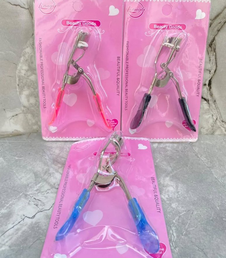 Pembe saplı renkli kirpik kıvırıcı, metalden üretilmiş, etkili kıvırma sağlar. Güzellik aletleri setinin parçası.