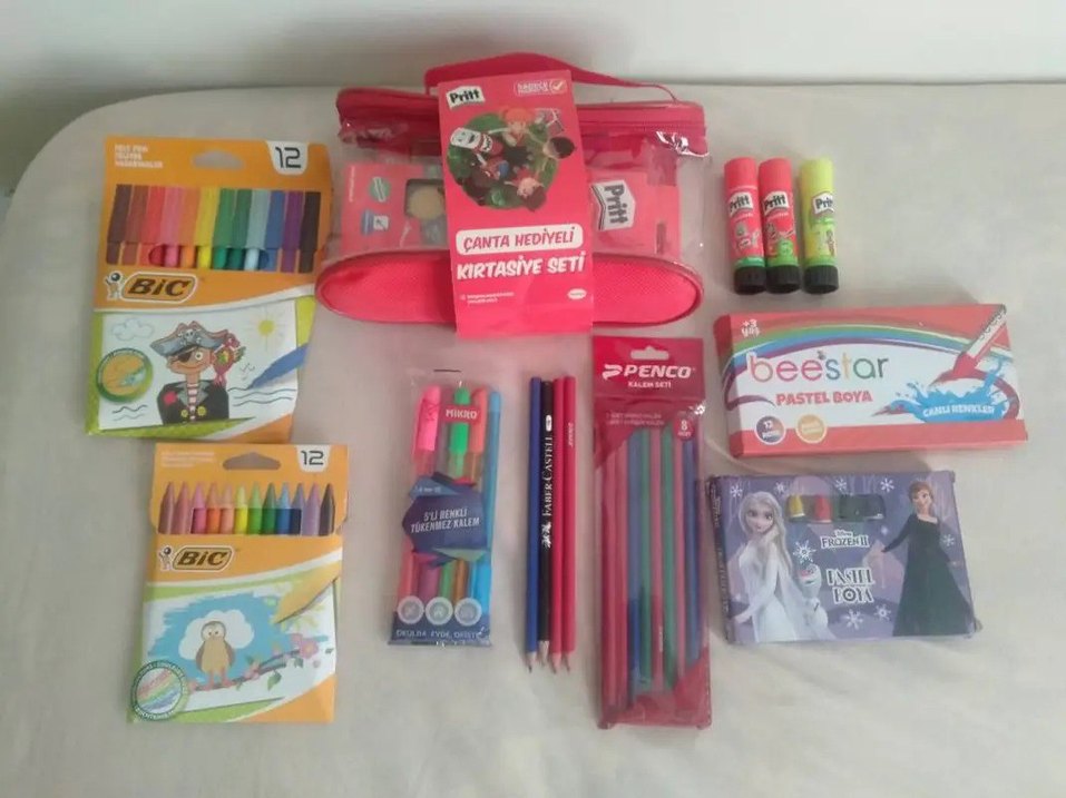 Pritt, Penco ve Bee Pastel markalı renkli kalemler, yapıştırıcılar ve pembe taşıma çantası içeren kırtasiye seti. ️ School bus kalemlik (internette satışı 500 liradır markasını verebilirim bakmak isteyenler için) BİC 12'li keçeli kalem BİC 12'li silinebilir pastel boya PRİTT ÇANTA HEDİYELİ KIRTASİYE SETİ (12 sulu boya+12 boya kalemi+12 keçeli kalem+2 adet yapıştırıcı) (Pritt kırtasiye seti yazarak Hepsiburada ve diğer sitelerden fiyatını görebilirsiniz) MİKRO 5'li renkli tükenmez kalem (satış fiyatı 150 liradır) PENCO kalem seti (6 adet kurşun kalem, 2 adet kırmızı kalem) BEESTAR 12'li pastel boya (Trendyol fiyatı 149 lira) DİSNEY 8'li Jumbo Boy Frozen Pastel Boya (Trendyol fiyatı 250 lira) + 2 adet kırmızı kalem, 2 adet kurşun kalem ve 1 adet pritt neon yapıştırıcı...Hepsi sıfırdır. Ürün fiyatlarını internetten araştırabilirsiniz.