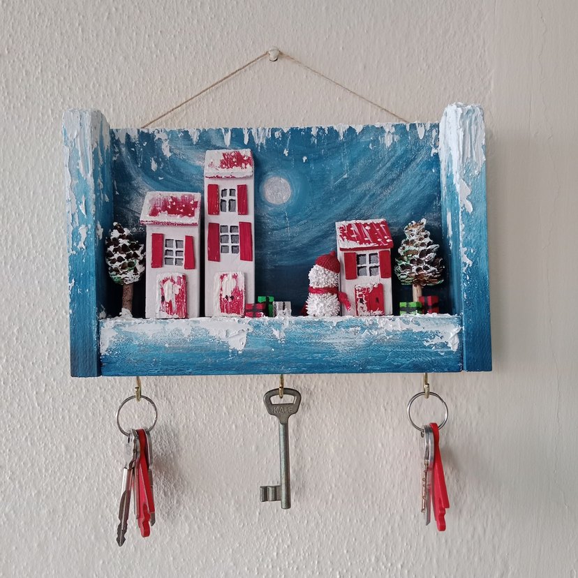 Mavi zemin üzerinde küçük evler ve ağaçlar bulunan renkli kış temalı anahtarlık, anahtarlarınızı düzenlemek için kullanılır.