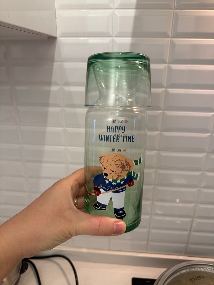 Beyaz, renkli kış temalı ayıcık desenli bebek biberonu. Üstü yeşil kapaklı. ❄️