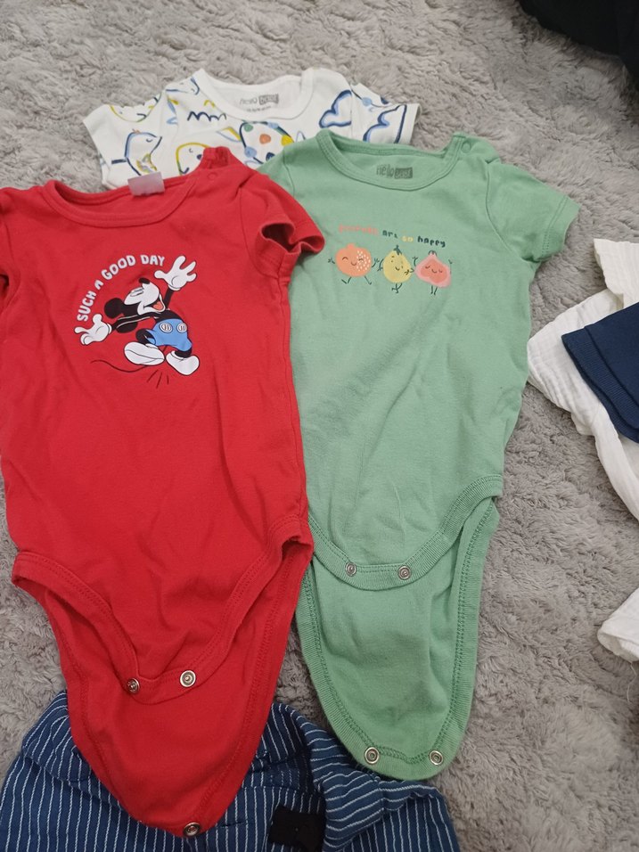 Pamuklu, kısa kollu, düğmeli ve bisiklet yakalı renkli bebek body seti, rahat sokak tarzı baskılarla.