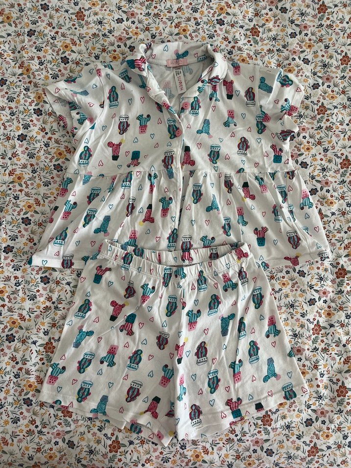 Renkli, kısa kollu ve bol kesim kadın pijama takımı. Bohem tarzda, rahat ve mini boyda, kaktüs desenli.