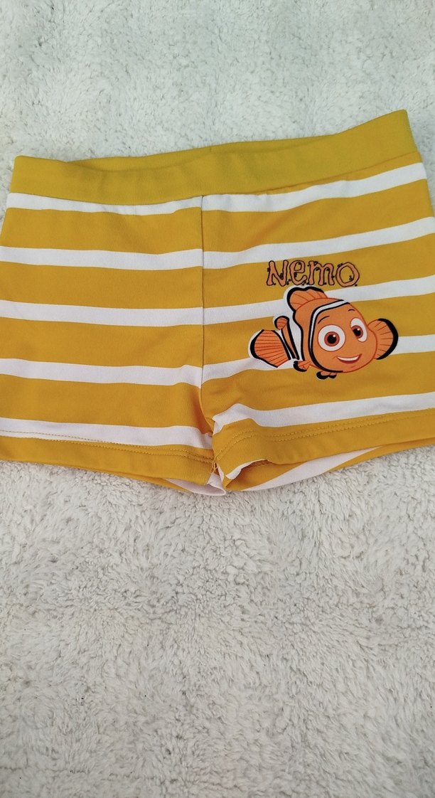 Renkli sarı ve beyaz çizgili, Nemo baskılı kısa kollu erkek çocuk mayo şortu. Rahat kesimli ve yüzme için uygundur.