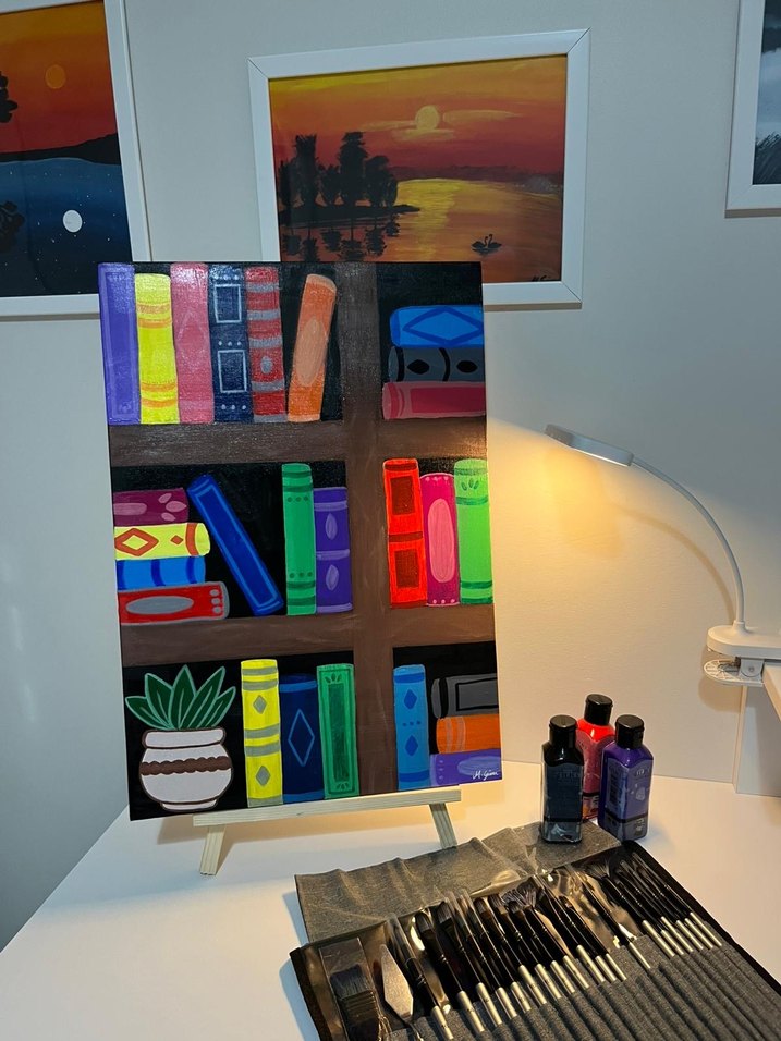 Bu tabloda, canlı renklerde kitaplar ve küçük bir saksı bitkisi bulunan renkli bir kitap rafı yer alıyor. Koyu tonlar, parlak renkleri ön plana çıkarıyor. Boyut:35✖️50