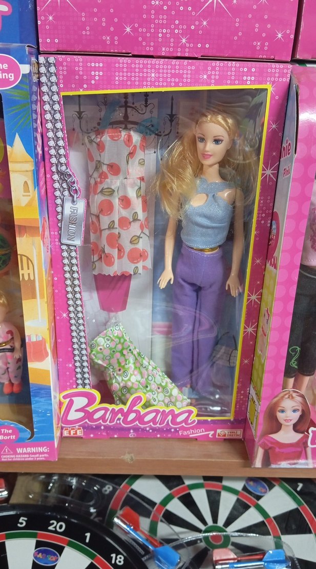 Sarı saçlı, mavi üst ve mor pantolonlu renkli Barbie bebek, ekstra kıyafet ve aksesuarlarla birlikte. WARNING etiketi mevcut.
