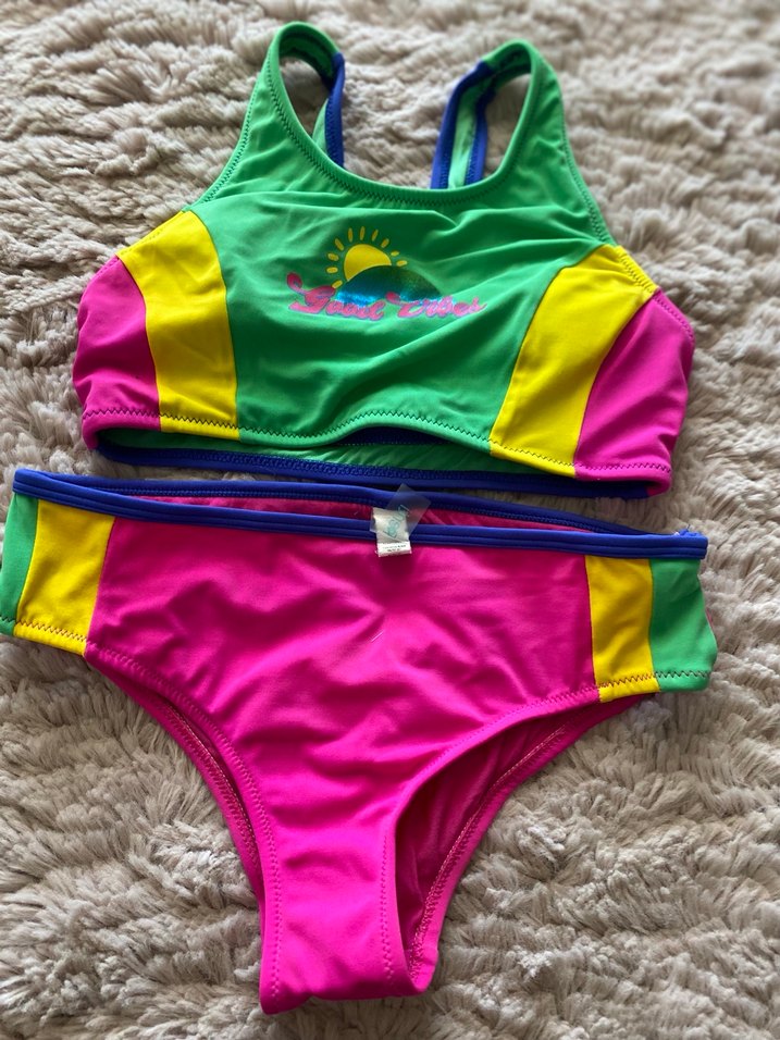 Renkli kız çocuk bikini takımı, ince askılı ve baskılı pop kültür desenli. Üstü yeşil, sarı ve pembe panellerle güneş motifi taşıyor, altı ise canlı renklerde uyum sağlıyor. ️