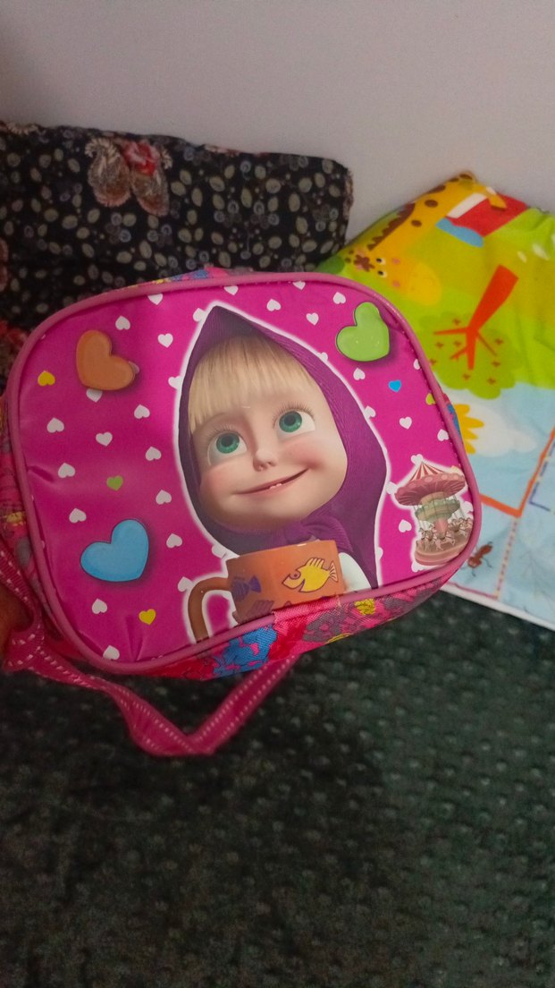 Renkli pembe okul beslenme çantası, kalp desenleri ve çizgi film karakteri baskılıdır. Omuz askılıdır.