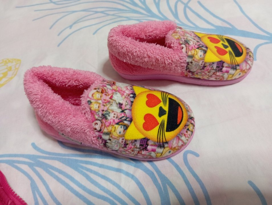 Renkli baskılı desenli, içi tüylü, yumuşak ve sıcak peluş kumaştan yapılmış kız çocuk terliği. Bohem tarzına uygun ve rahat.