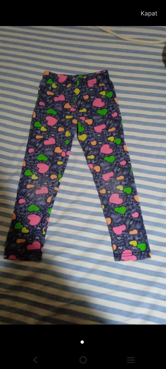 Renkli kalpli desenlere sahip, elastik sentetik kumaştan yapılmış kız çocukları için dar kesim tayt. Trend sokak stili için uygun.