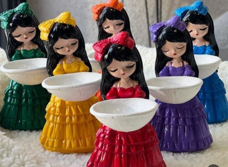 Kız figürlerinin tuttuğu beyaz kaseler, kırmızı, sarı, turuncu ve mor renklerde canlı elbiselerle dekoratif amaçlıdır.