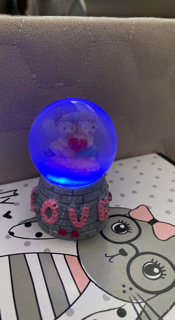 Kırmızı mavi ışıklı kürenin içinde kız ve erkek figürü bulunan, taş görünümlü ve çiçek detaylı renkli kar küresi.❄️