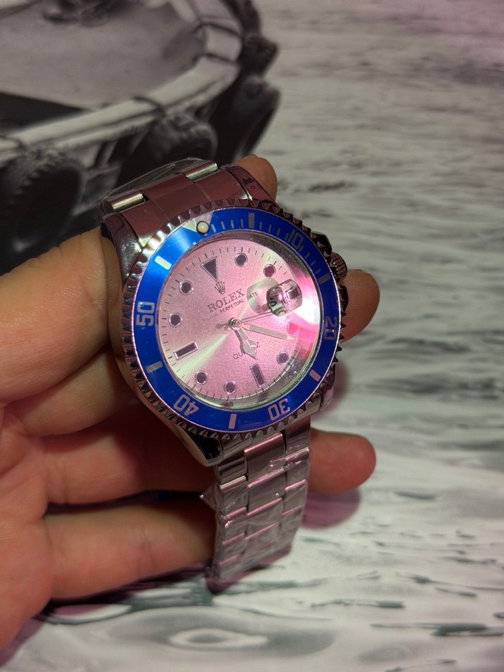 Bu erkek kol saati, pembe kadran ve mavi bezel ile renkli bir tasarım sunar, klasik stil ile streetwear etkisini birleştirir. ⌚