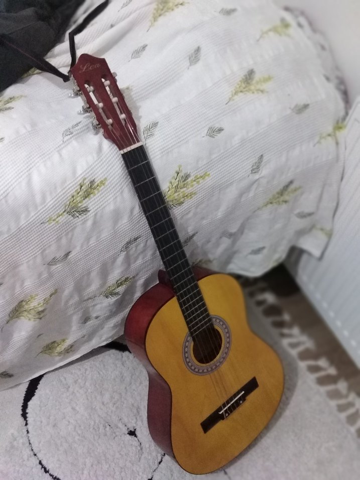 Kahverengi gövdesi ve koyu klavyesi olan renkli klasik gitar, çeşitli müzik tarzlarına uygun geleneksel tasarıma sahiptir.