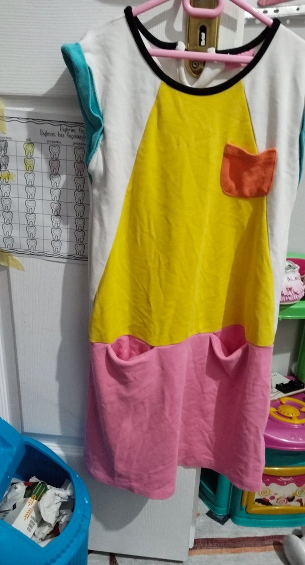 Kolsuz, yuvarlak yakalı, bol kesim kız elbisesi. Sentetik kumaştan, pastel tonlarda renkli baskılı ve küçük cepli, drapeli tasarıma sahip.
