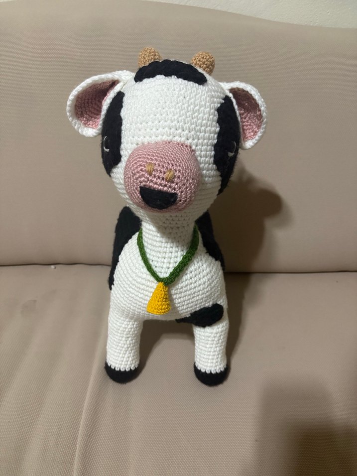 Bu beyaz örgü inek peluş oyuncak, renkli detaylar ve sarı kolye ucu olan yeşil bir kolye içerir. Yumuşak ve el yapımıdır.