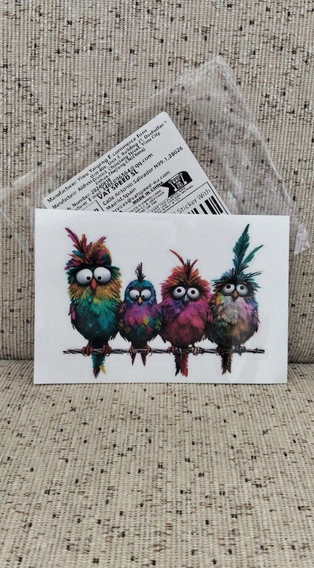 Dört renkli, tüylü ve büyük gözlü komik kuşun bir dalda oturduğu eğlenceli kartpostal, Çıkartma. 2'si beraber
