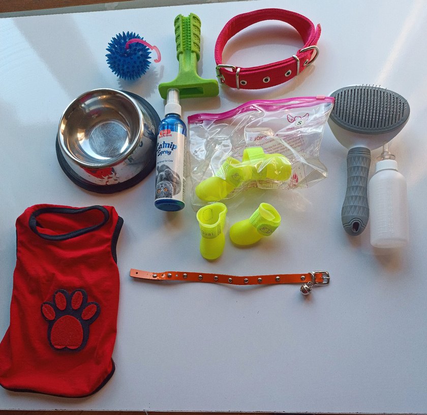 turuncu zilli tasma, mama kabı, ıssırma oyuncağı aleti, koruyucu pati botları, S beden kedi ve köpeklere uygun kostüm, tüyleri taramak için fırça,pembe tasma, oyuncak mavi top(zıplıyor) ve sprey. 2aylık köpeğim için kullanıldı. Ürünler yeni gibidir.