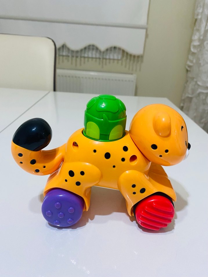 Çeşitli dokulu tekerlekleri ve üstünde yeşil butonu olan renkli köpek figürlü oyuncak. Tertemiz yeni üst kısmındaki yeşil kısmına basıldığında otomatik kendisi gidiyor