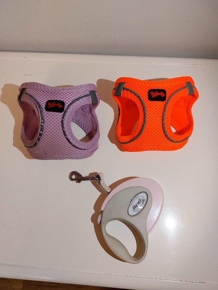 Mor ve turuncu renklerde, nefes alabilen file kumaştan köpek göğüs tasması ve rahat tutuşlu otomatik gezdirme tasması.