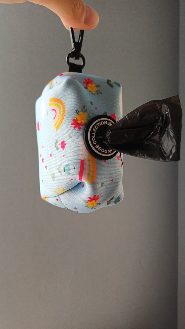 Çiçek ve gökkuşağı desenli, yumuşak kumaştan yapılmış, kolay takılabilen klipsli renkli köpek dışkı poşeti tutucusu.